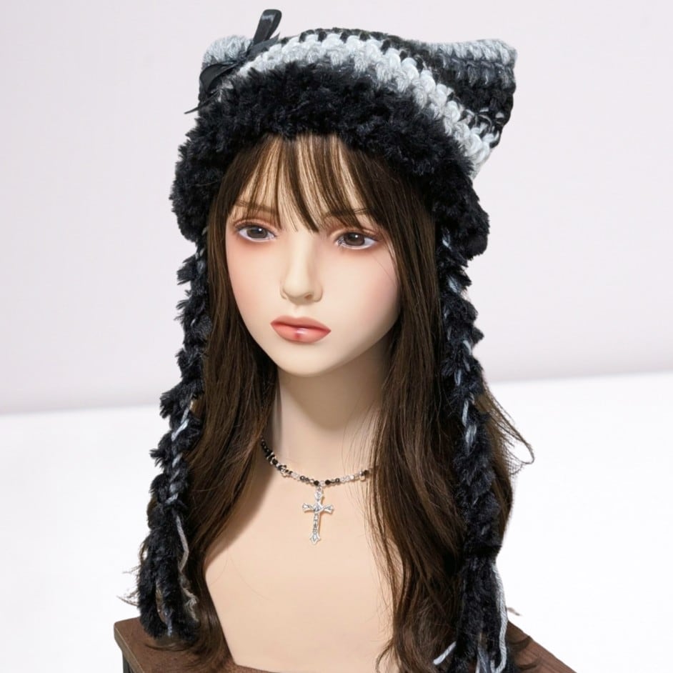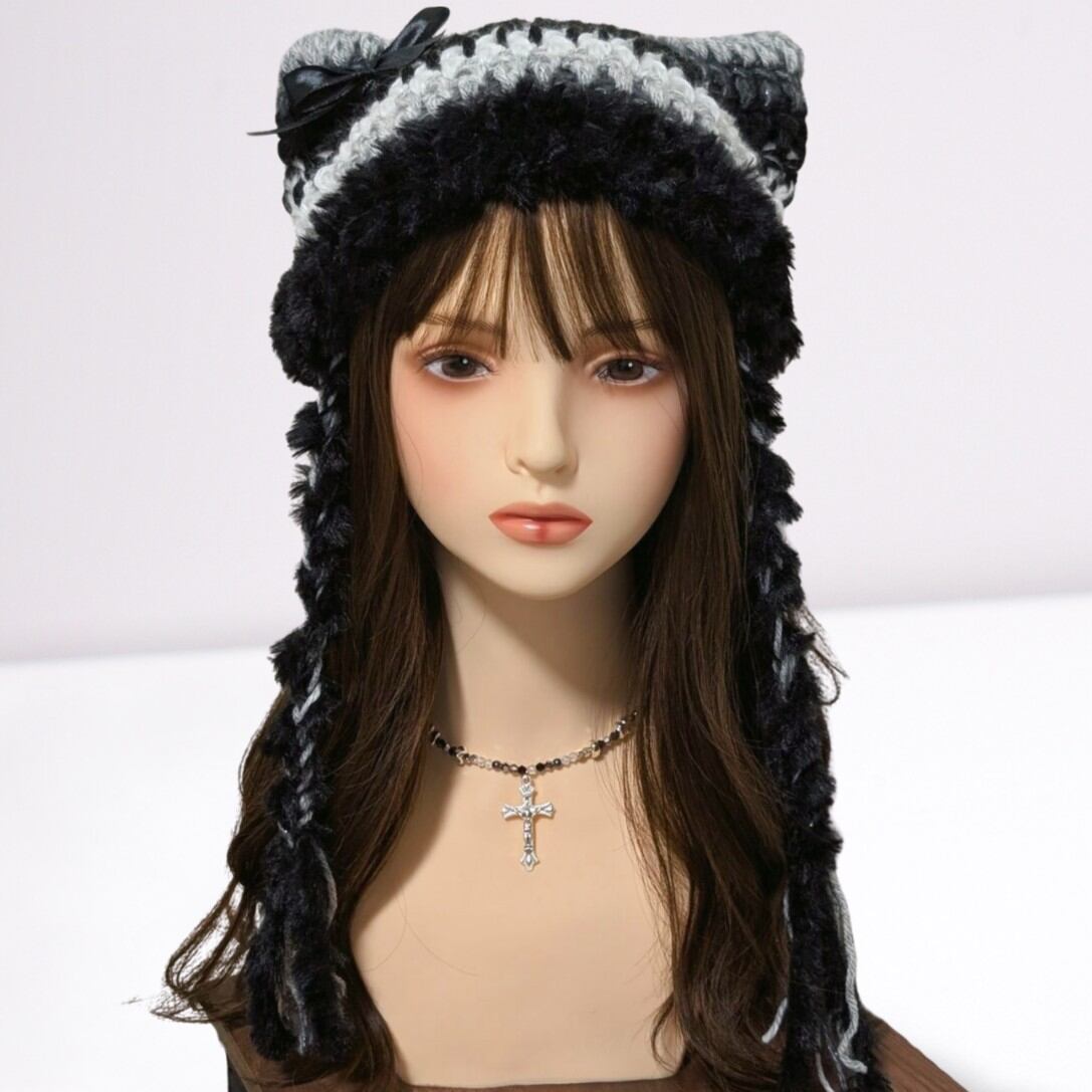 モノクロのハンドメイド猫耳ニット帽✮*。゚