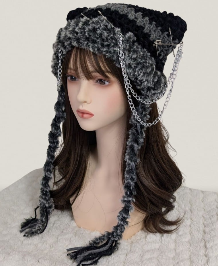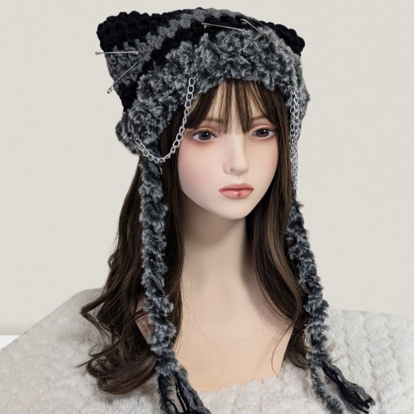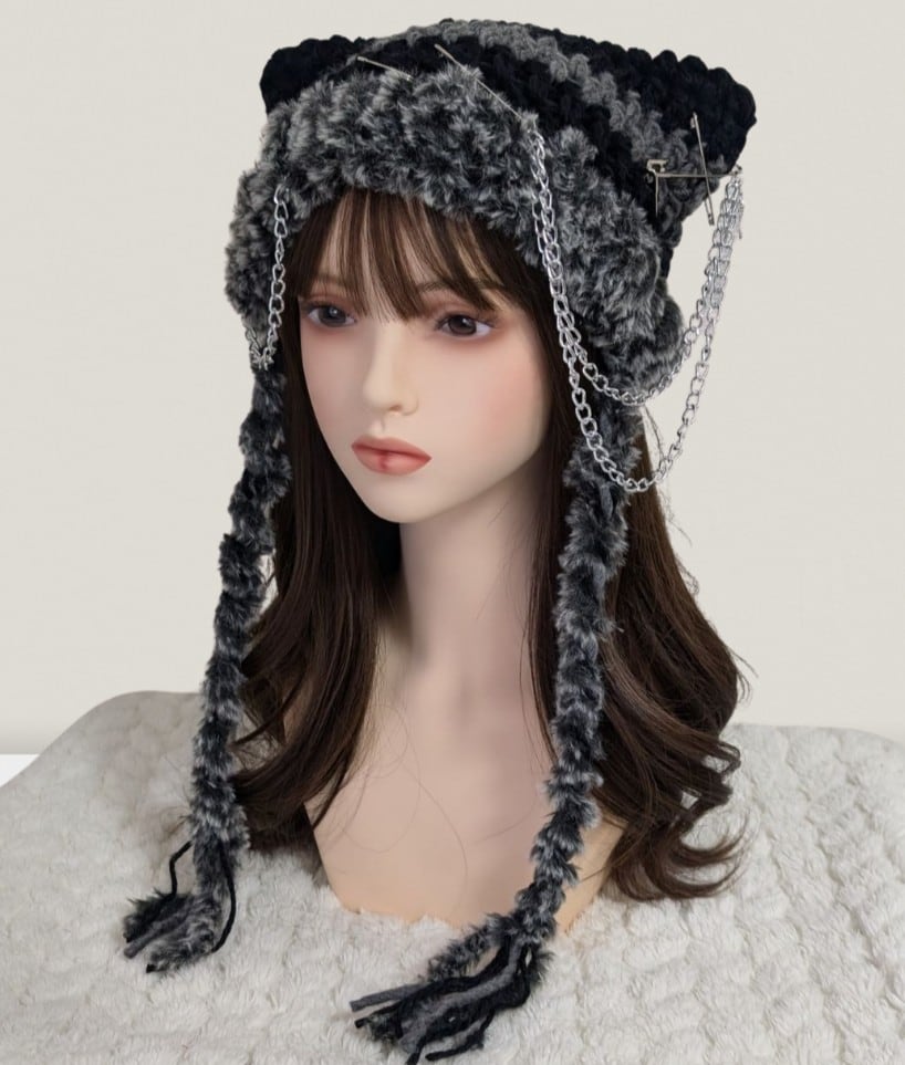 Cat Beanie^_ ̫_^ black×grey×chain