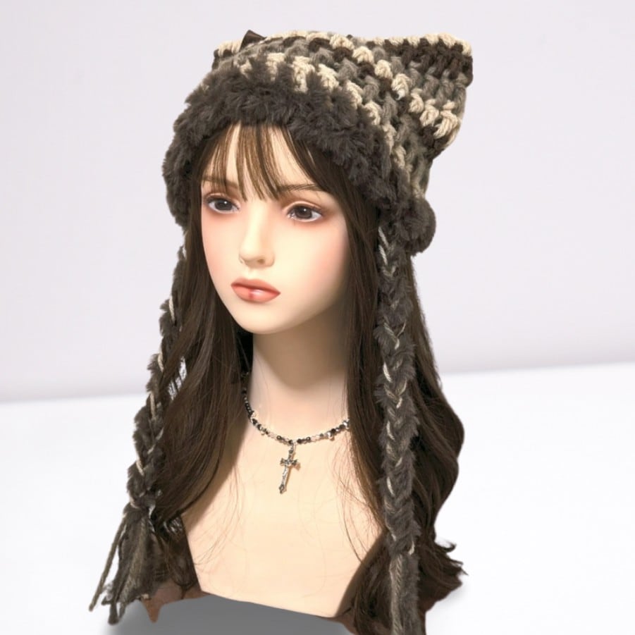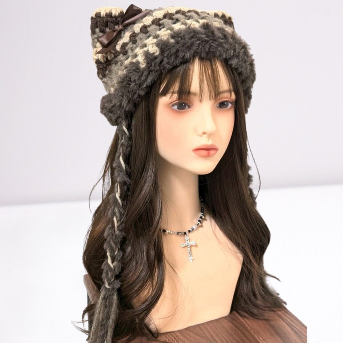 ダークチョコレートのようにビターで甘く、とろけるような可愛さの、ハンドメイド猫耳ニット帽✮*。゚
